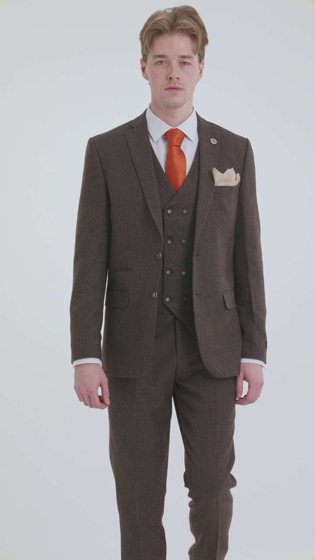 * Klasszikus, 1920-as évekbeli halszálkás tweed öltöny, testreszabott szabással (a karcsúsított és a normál szabás között)